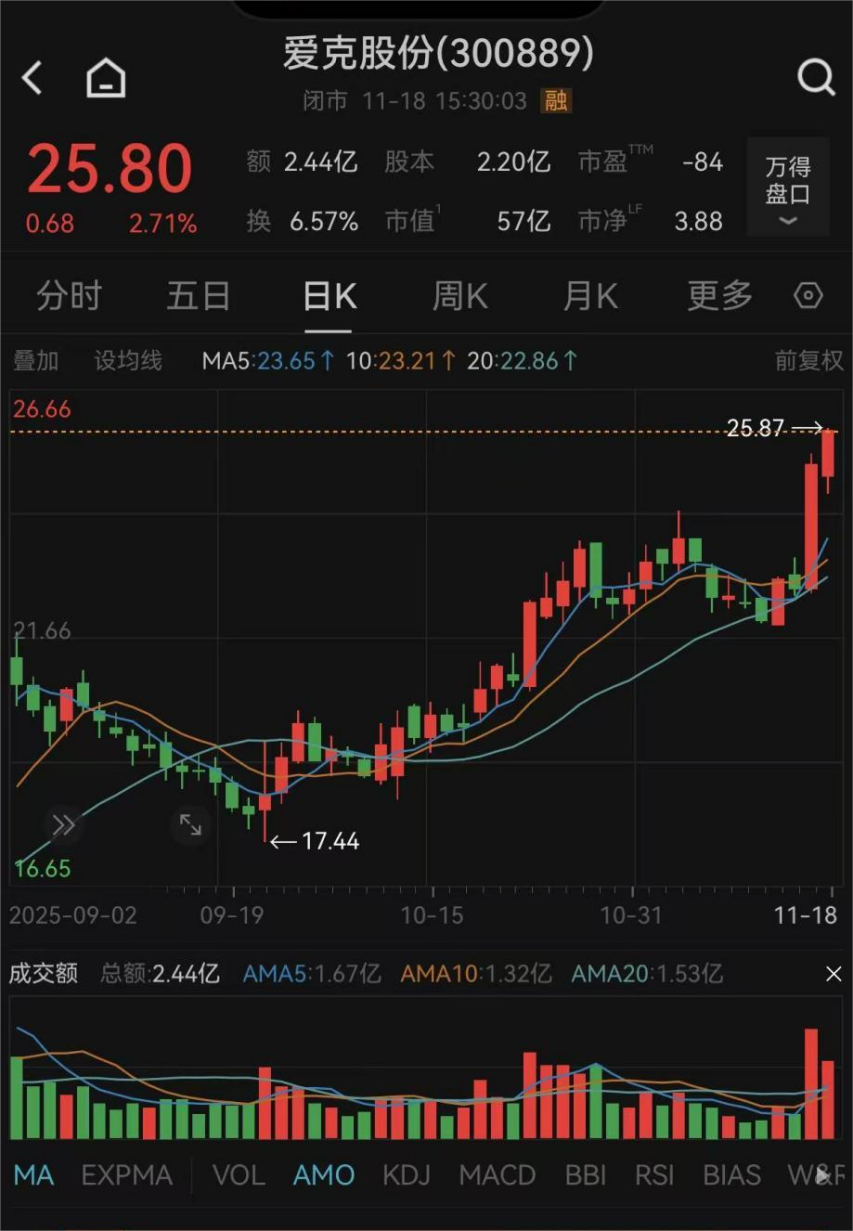 截至11月18日收盤(pán),愛(ài)克股份每股報25.8元,上漲2.71%,公司最新市值為57億元。