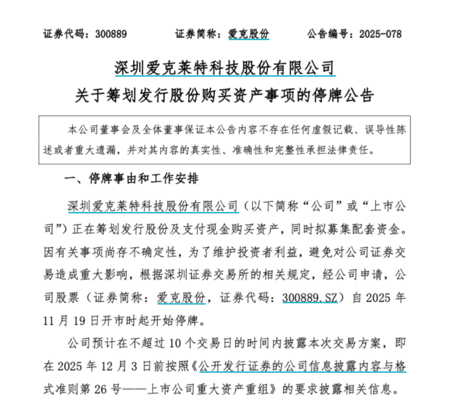 11月18日,愛(ài)克股份(300889)發(fā)布公告稱(chēng),公司正在籌劃發(fā)行股份及支付現金購買(mǎi)資產(chǎn),同時(shí)擬募集配套資金。因有關(guān)事項尚存不確定性,為了維護投資者利益,避免對公司證券交易造成重大影響,經(jīng)申請,公司股票自11月19日起停牌。