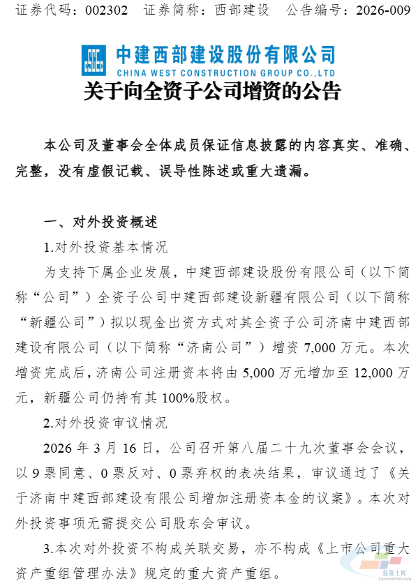 西部建設(shè)(002302)(SZ 002302)3月16日晚間發(fā)布公告稱,為支持下屬企業(yè)發(fā)展,中建西部建設(shè)(002302)股份有限公司全資子公司中建西部建設(shè)(002302)新疆有限公司擬以現(xiàn)金出資方式對其全資子公司濟(jì)南中建西部建設(shè)(002302)有限公司增資7000萬元。