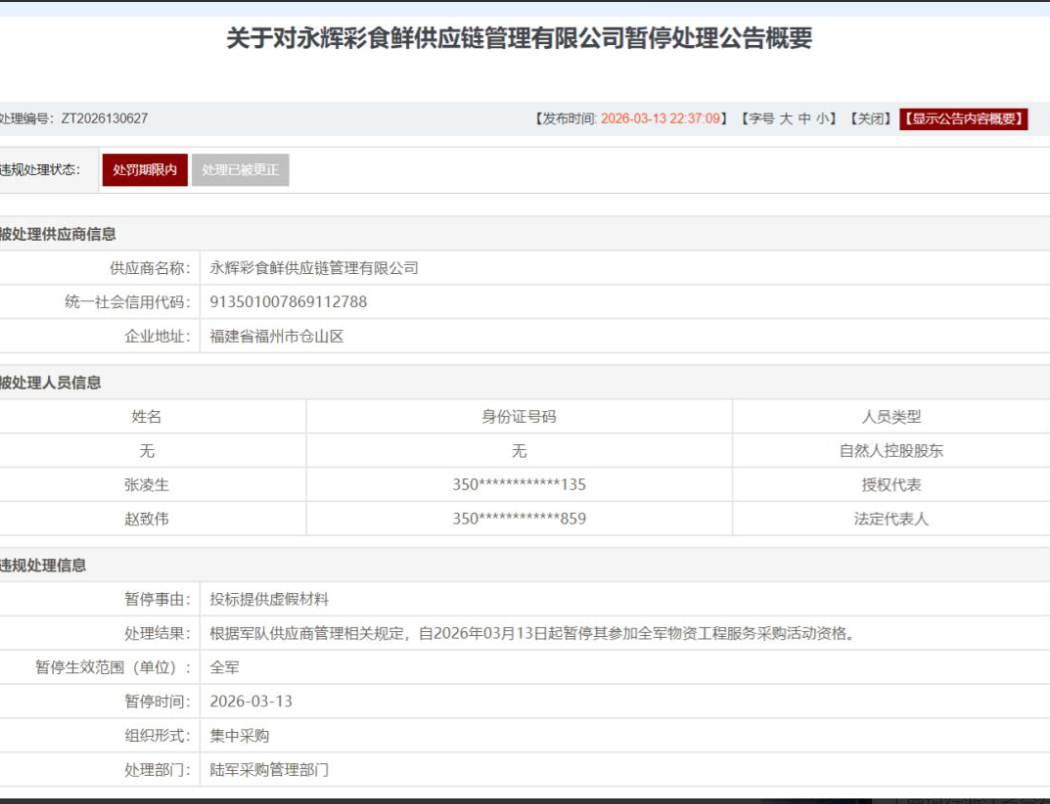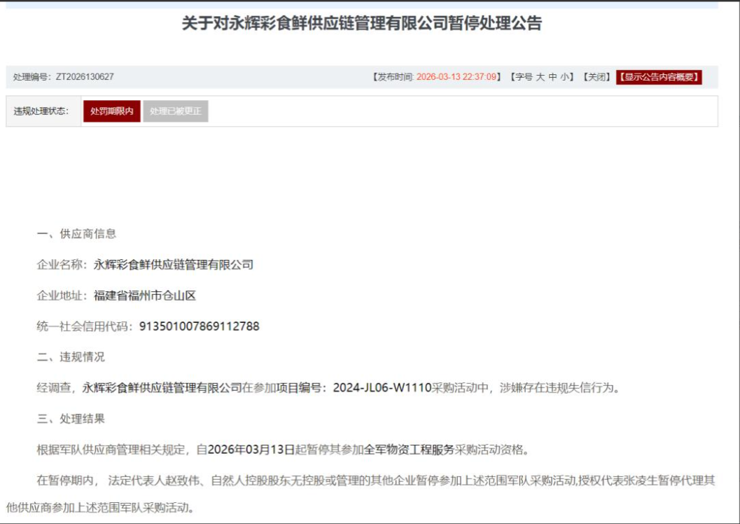 近日,軍隊采購網(wǎng)發(fā)布一則處罰公告,永輝彩食鮮供應鏈管理有限公司因在采購活動中提供虛假材料,被陸軍采購管理部門處以暫停參加全軍采購活動資格的處罰,處罰自2026年3月13日起正式生效。