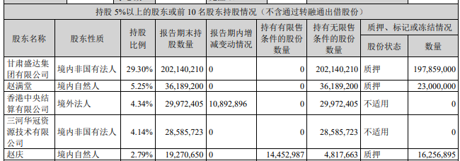 財報顯示,公司控股股東或第一大股東及其一致行動人累計質(zhì)押股份數(shù)量占其所持公司股份數(shù)量比例達(dá)到80%。其中,甘肅盛達(dá)集團(tuán)有限公司質(zhì)押1.98億股,趙滿堂質(zhì)押2300萬股,趙慶質(zhì)押1625.69萬股。