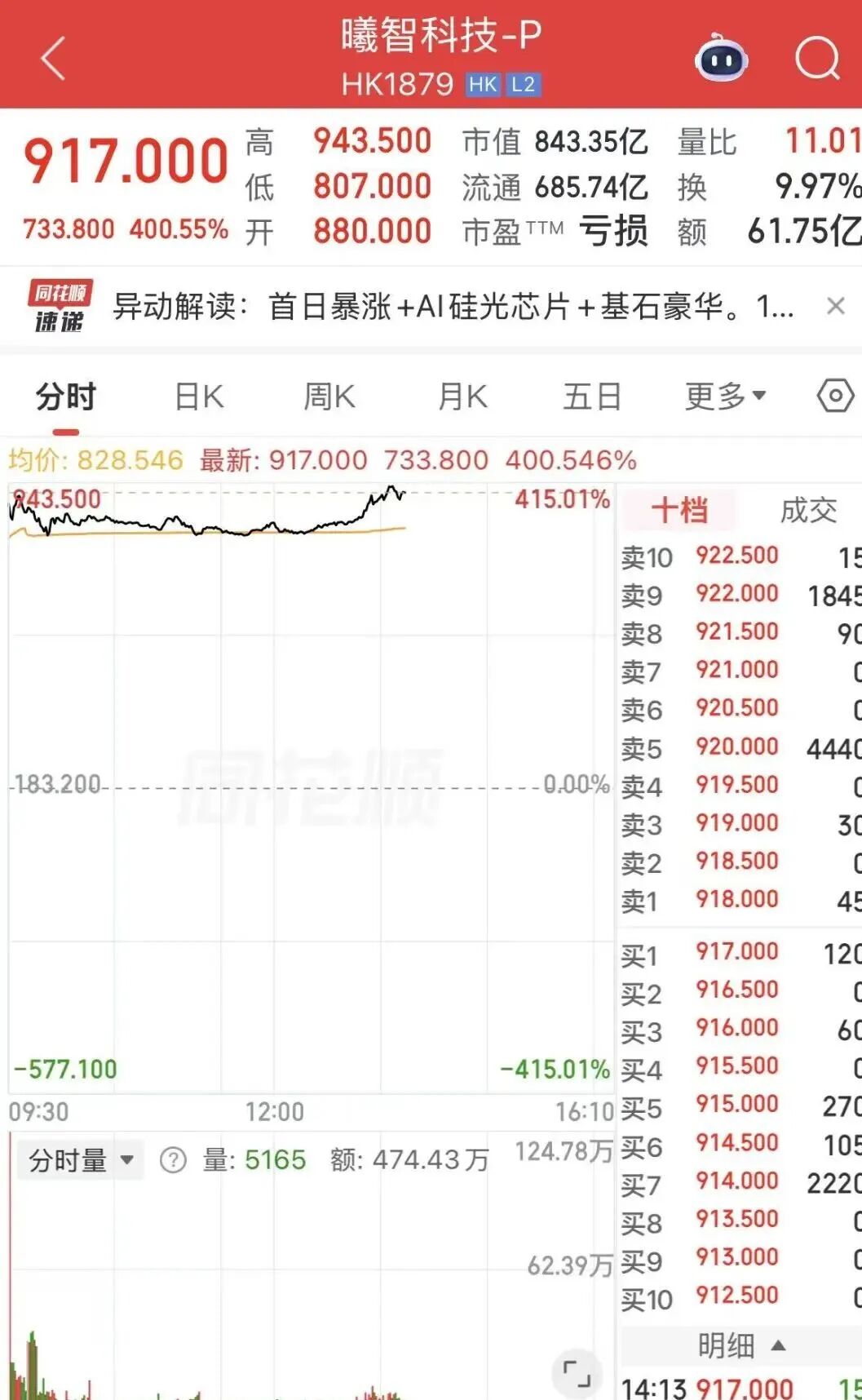 新股曦智科技盤中漲超400%